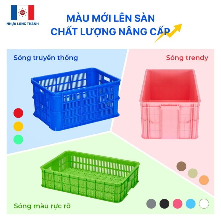 Sóng nhựa Long Thành hiện có 4 màu tiêu chuẩn: Dương, Đỏ, Lá, Vàng - giúp phân loại hàng hóa dễ dàng.